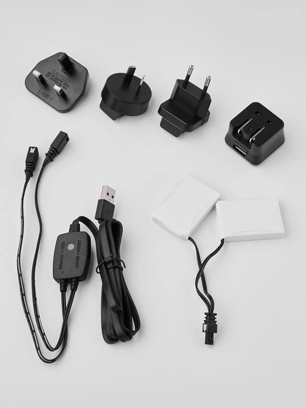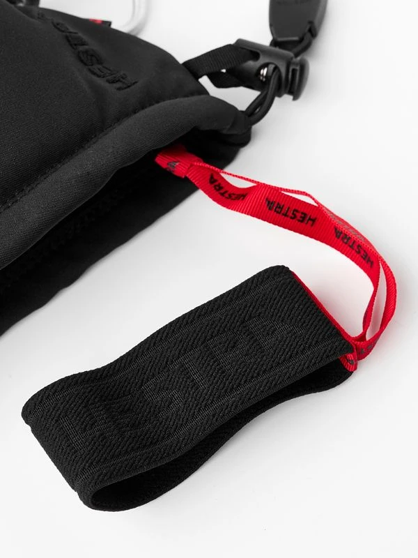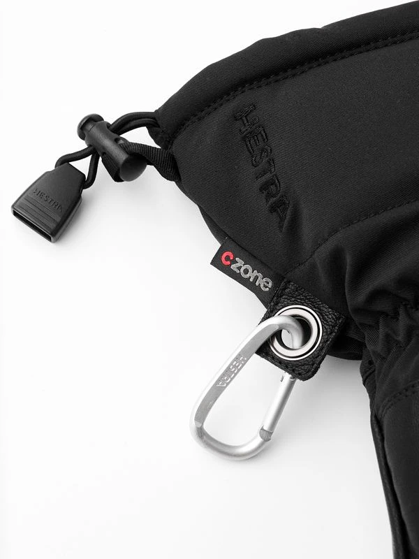 Elastic at wrist | Handcuffs | Heating components on backhand, fingers, and thumb | Rechargeable batteries | Snow lock